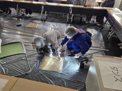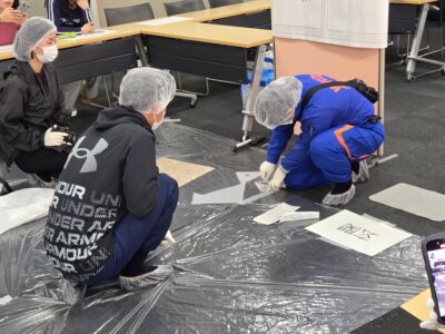 また、実際に指紋や足跡などの証拠採取の体験もさせていただき、学生たちはその臨場感あふれる様子に引き込まれていました。
