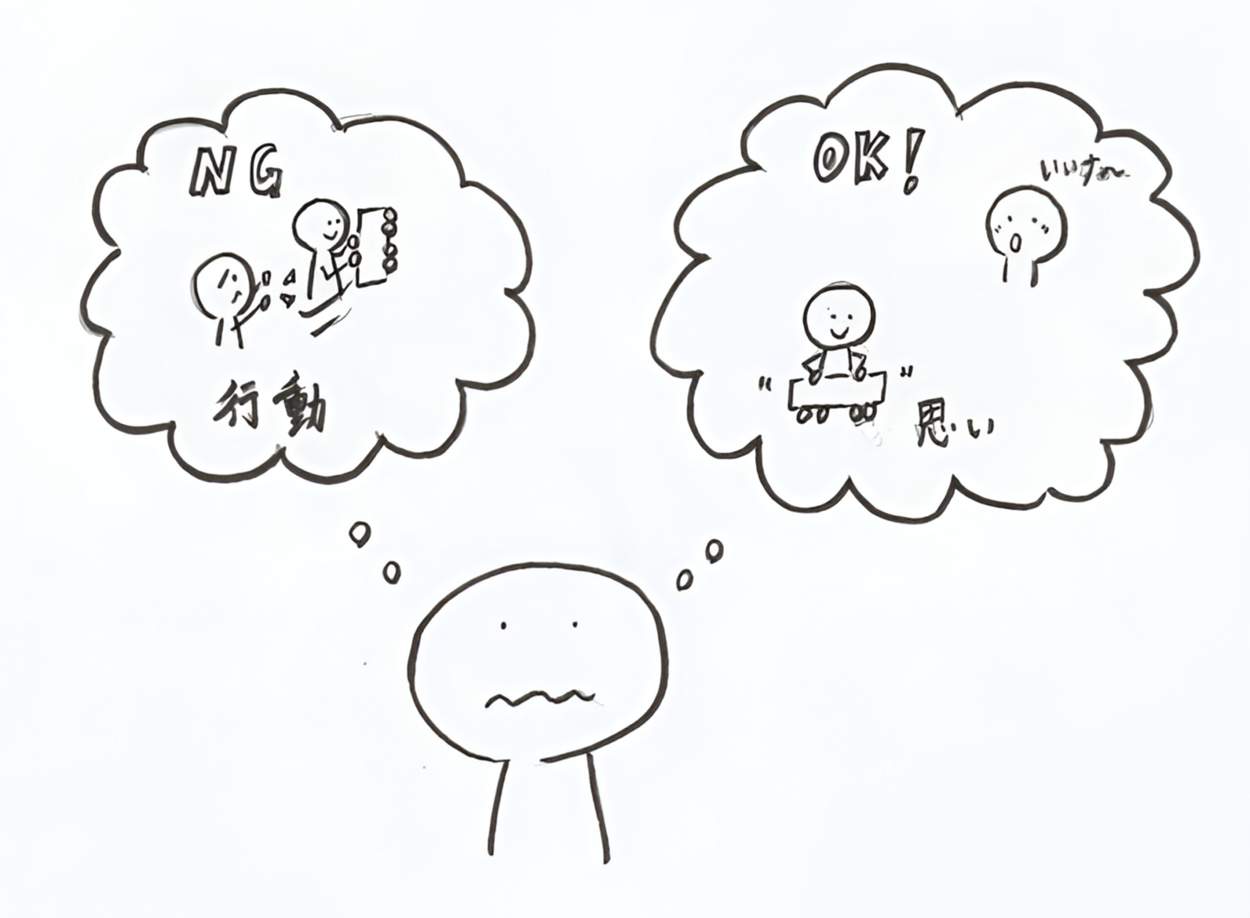 ある子どもが、友達が手にして遊んでいたおもちゃを許可なく奪い取り、友達は泣き出してしまいました。「行動」は“友達のおもちゃを奪う”ですので、これ自体はNGです。対応としては、「友達が遊んでいるのを取ったらだめだよ」と注意する、あるいは「貸してって言おうね」と許可の取り方を教えるのもよいかもしれません。一方で、「感情や思い」に着目するとどうでしょうか。友達が楽しそうに遊んでいる様子を見て“ぼくもあれで遊びたい”“面白そう!”と思ったのかもしれません。