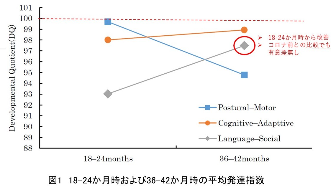 本研究では、18-24か月時の調査に参加した子どもたちのその後の発達経過を確認するため、子どもたちが生後36-42か月になった時点で再度発達調査を実施しました。その結果、36-42か月時においては言語面の発達指数がコロナ前の子どもと比しても差がない程度まで改善していることが明らかとなりました(図1)。