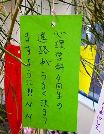 7月7日、イオンモール京都五条で開催された七夕イベントに、心理学科の学生たちがボランティアとして参加したそうです。そのイベント準備の関係で、当日の夕方まで、心理学科にも、七夕飾りの笹が置いてありました。七夕飾りに彩られた笹のお蔭で、季節が感じられて、心理学科のフロアに来るたびに癒されていました。
