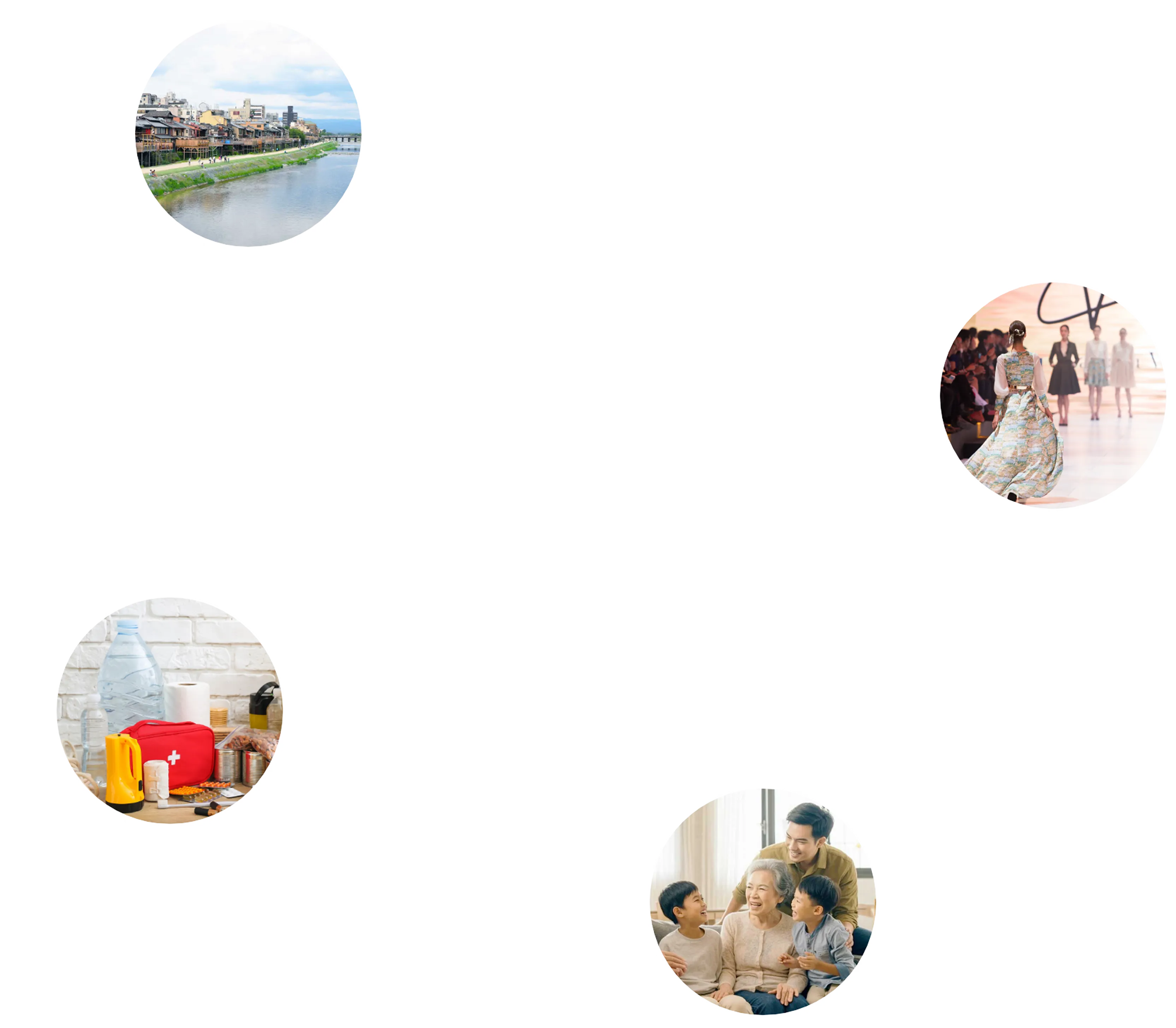 企業や家庭から提供いただいた着物を、地域の作業所との共創によってリメイクし、伝統と現代の感性を融合した新たなファッションアイテムに生まれ変わらせます。制作品は、お寺などと連携し、京都らしい空間でのショーや販売会で披露します。