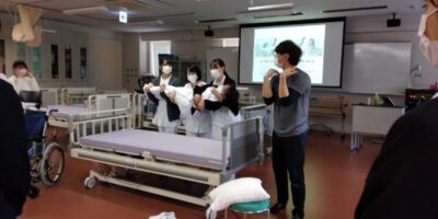 毎年、この時期に、「言語聴覚障害総合演習(検査・機器)」の授業に、理学療法士の真下英明先生に来ていただいて、腰を痛めないポジショニングとトランスファーの方法を、実技中心に学びます。受講するのは、長期実習を控えた3年生です。