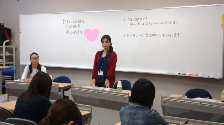 1回生の授業「女性と社会福祉」では、10月29日(木)にゲストスピーカーをお迎えし、“子育てと仕事の両立”をテーマにお話を伺いました。